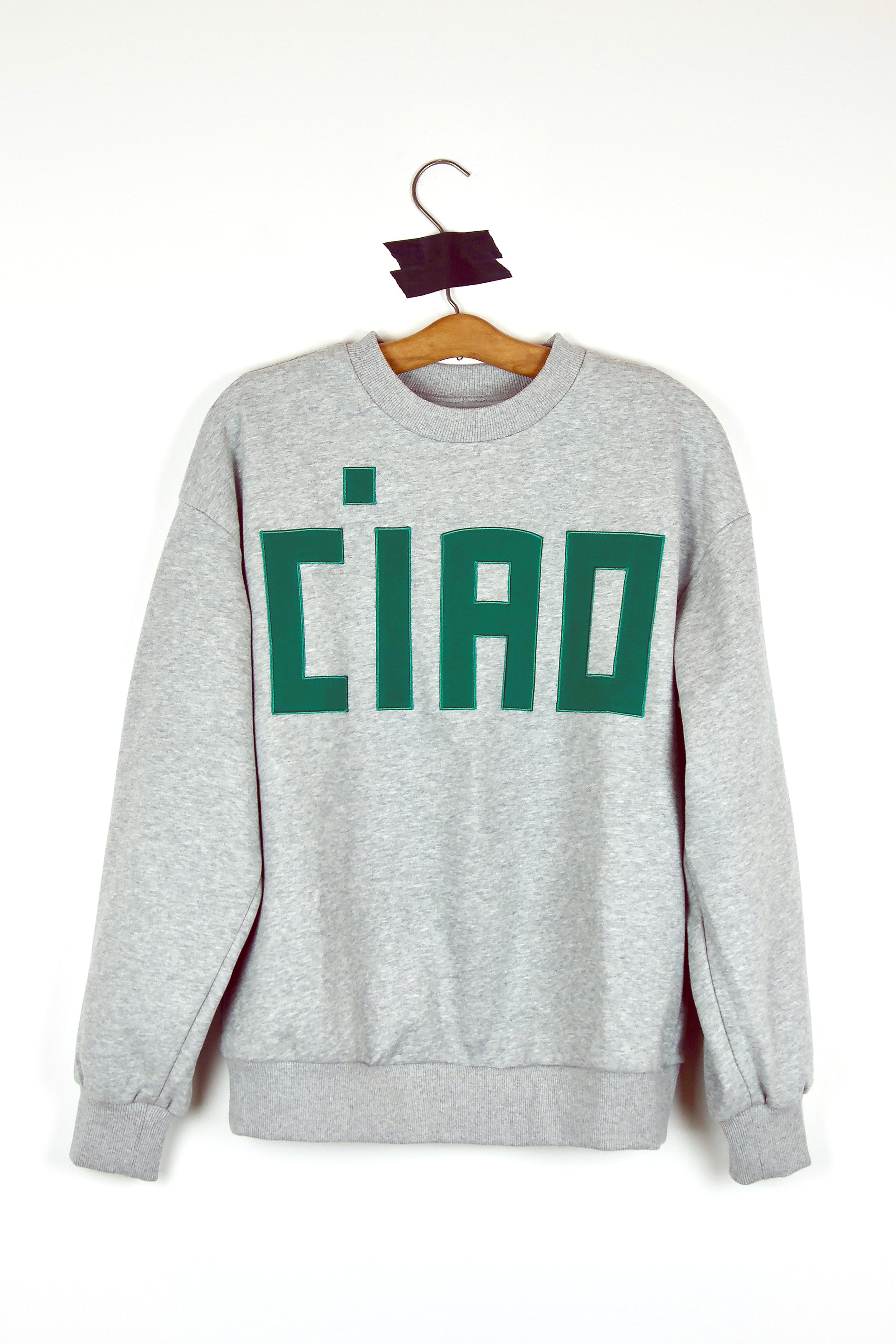 Say hello (or goodbye) to your new favorite layer. This heather gray sweatshirt brings a touch of European flair to your everyday casual rotation. Featuring "CIAO" in bold, deep forest green block letters, it’s the perfect mix of preppy and playful.